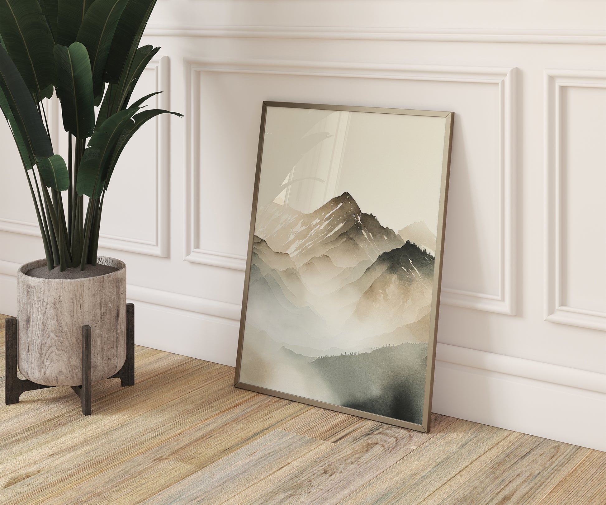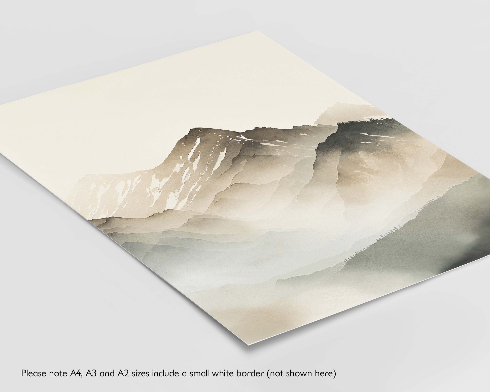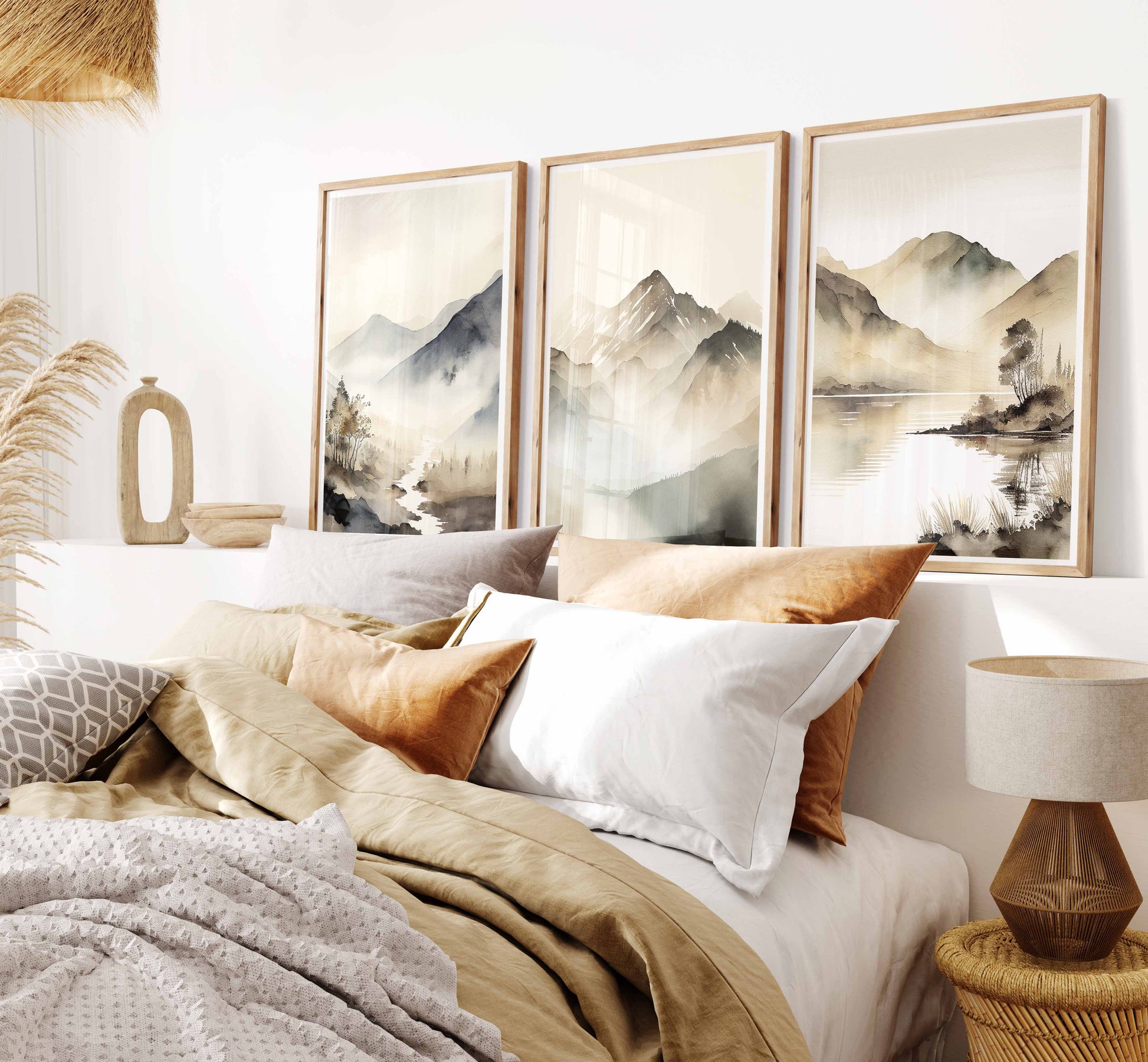 A set of 3 watercolour landscapes featuring large mountains, trees and misty lakes in a cream, beige and grey wash. Printed on 300gsm premium lustre-finish paper.