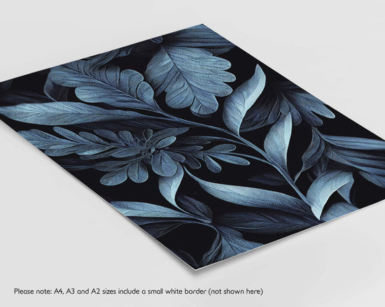 A stunning set of 2 illustrated blue prints featuring abstract oak leaves pattern against a black background. Printed on 300gsm premium lustre-finish paper.