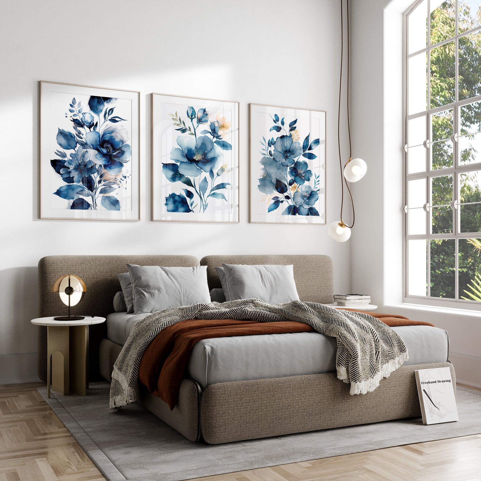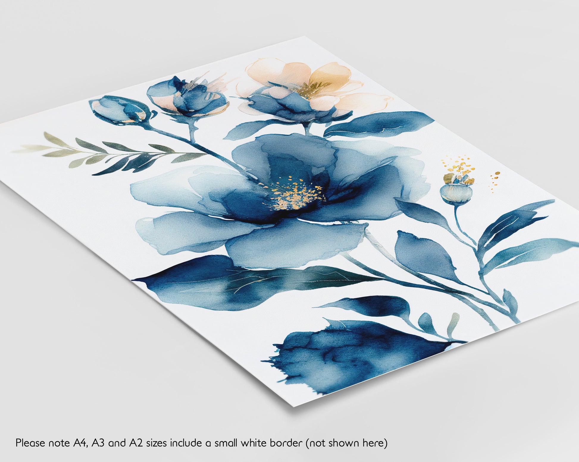 A set of 3 blue watercolour flower prints. Printed on 300gsm premium lustre-finish paper.