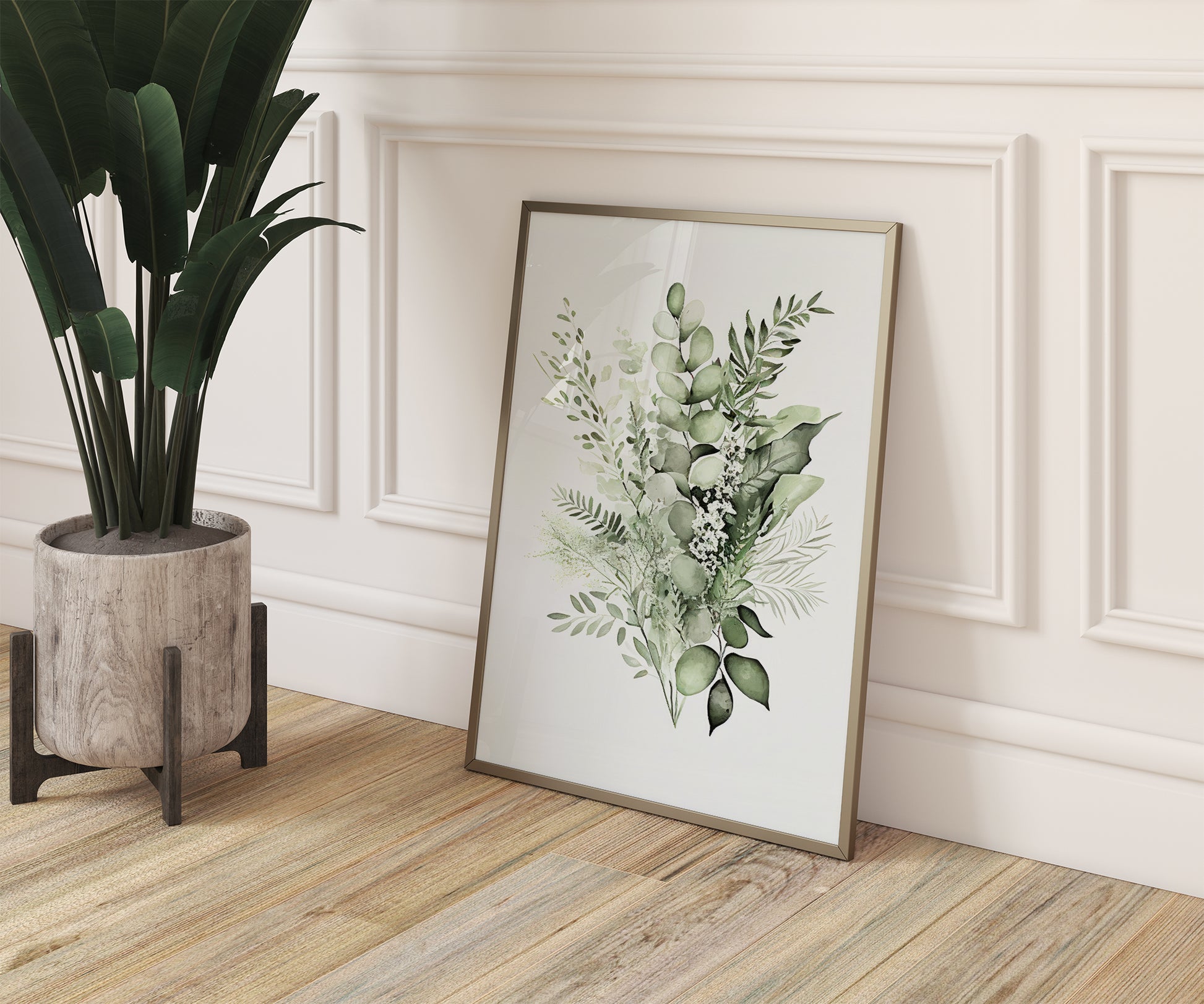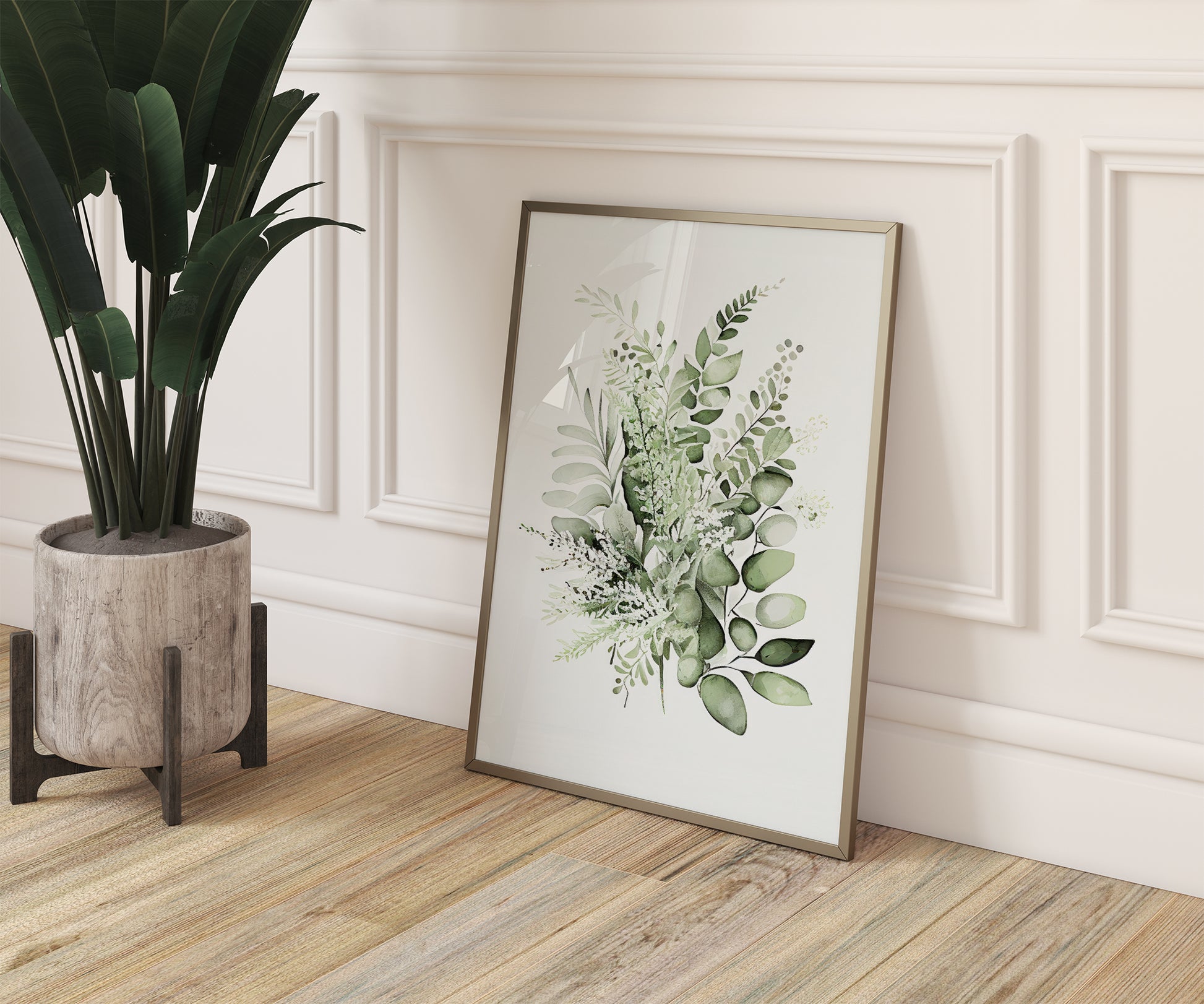 A set of 3 green watercolour eucalyptus and ferns leaves prints. Printed on 300gsm premium lustre-finish paper.