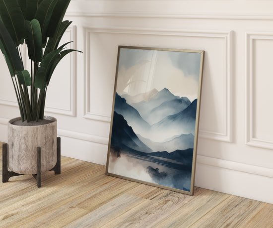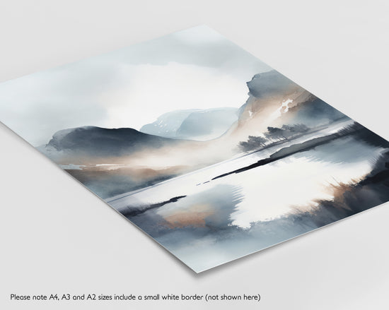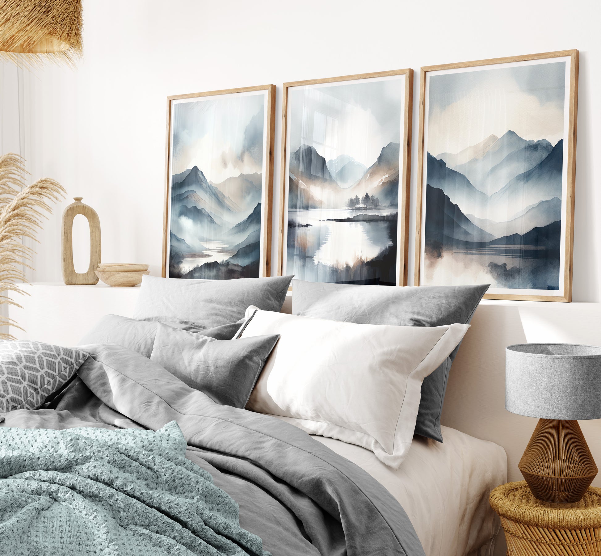 A set of 3 watercolour landscapes featuring misty mountains and lakes in a blue wash. Printed on 300gsm premium lustre-finish paper.