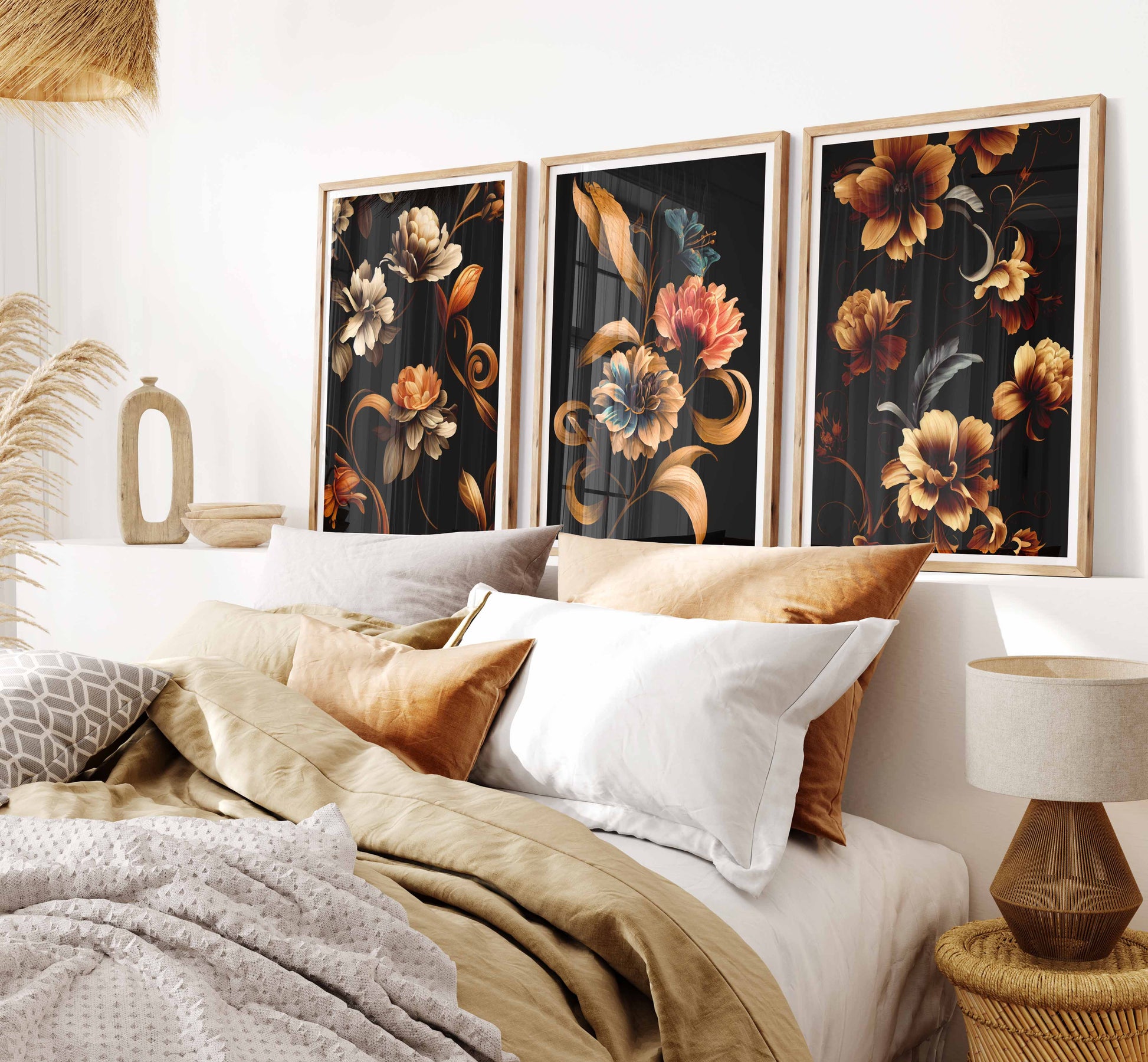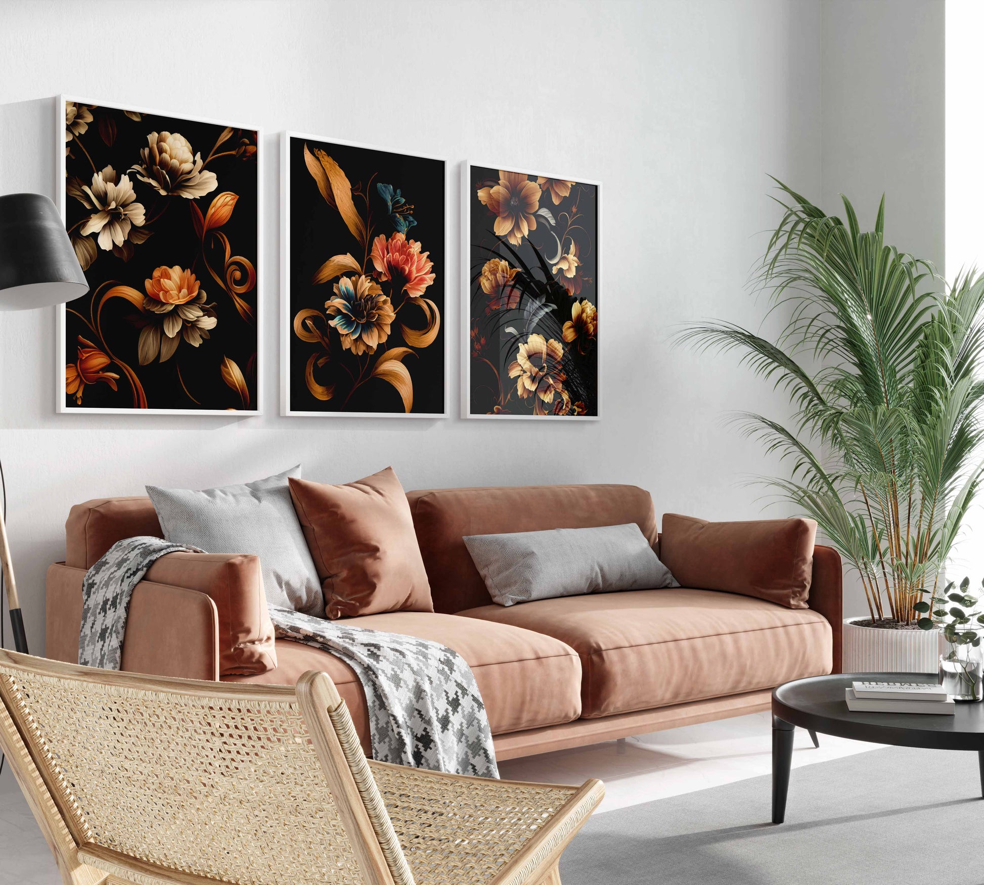A set of 3 vintage-inspired botanical floral illustration prints. Swirly leaves and earthy toned flowers against a black background. Printed on 300gsm premium lustre-finish paper.