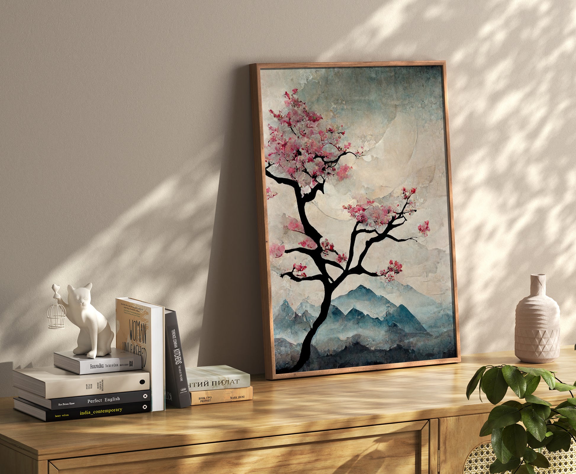 Japanese style beautiful print featuring a pink cherry blossom tree against a blue mountain landscape. Printed on 300gsm premium lustre-finish paper.