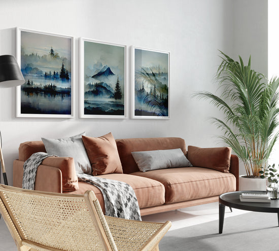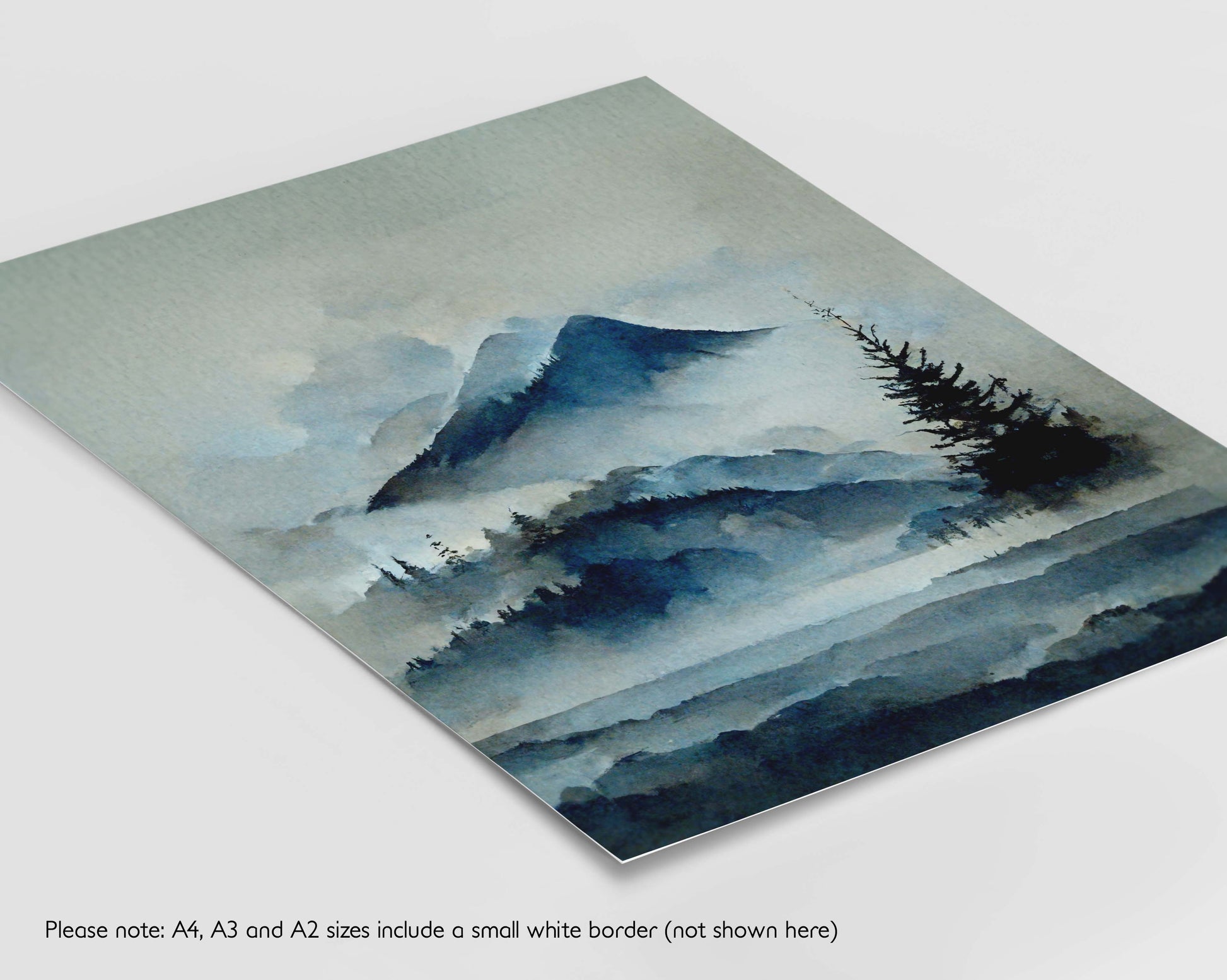 A set of 3 watercolour landscapes featuring foggy fir trees, misty lakes and steep mountains in a navy, black and green wash. Printed on 300gsm premium lustre-finish paper.